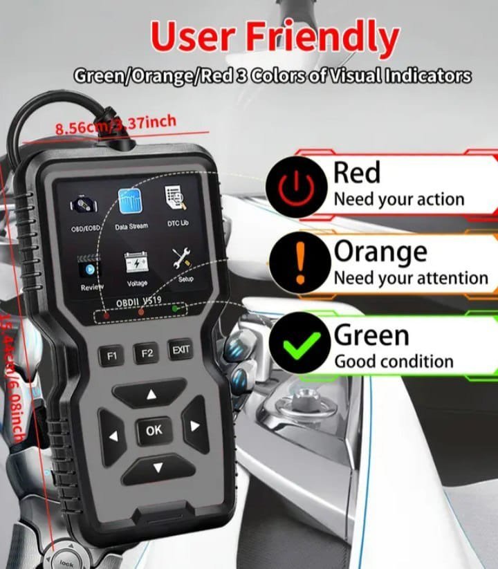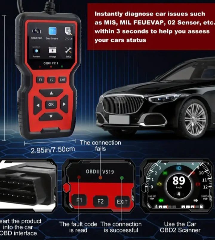 The V519 Car Scanner is a powerful, user-friendly OBD2 diagnostic tool designed for car owners, drivers, and mechanics who want quick and reliable vehicle health checks. Simply plug it into your car’s OBD2 port, start the engine, and get real-time insights into your vehicle’s performance. No Apps, no phone, no stress.